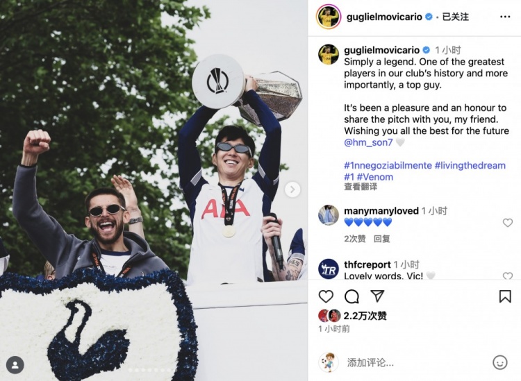 維卡里奧寫(xiě)道:孫興慜是一個(gè)傳奇。他是我們俱樂(lè )部歷史上最偉大的球員之一,更重要的是,他是個(gè)頂級的好友。