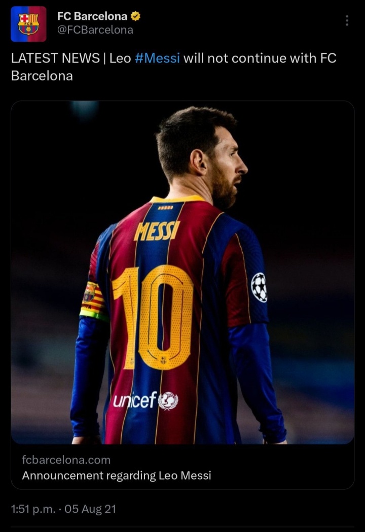 西班牙當地時(shí)間2021年8月5日,巴塞羅那俱樂(lè )部發(fā)布官方公告,宣布無(wú)法與梅西完成續約。如今距離這則公告發(fā)布已經(jīng)過(guò)去四年。