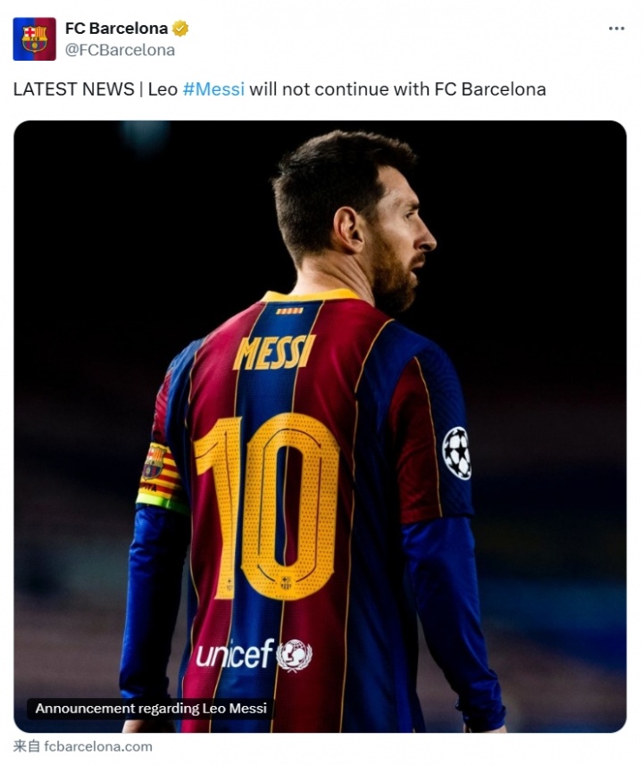 巴薩衷心地感謝梅西為俱樂(lè )部的壯大而做出的貢獻,祝愿他未來(lái)生活和職業(yè)生涯一切順利!