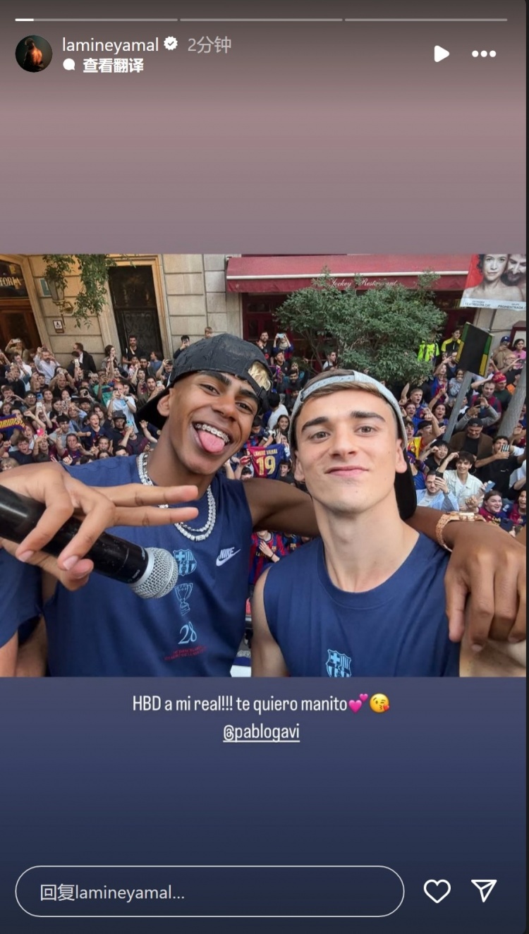 巴薩中場(chǎng)加維迎來(lái)21歲生日,亞馬爾社媒曬出與加維在冠軍游行中的合照,配文:“生日快樂(lè ),我的摯友!我愛(ài)你,兄弟!”
