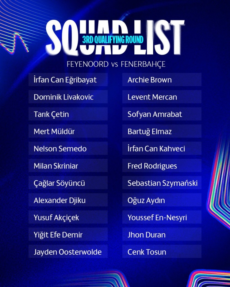 8月5日訊 費內巴切公布了歐冠資格賽第三輪對陣費耶諾德大名單,恩內斯里、弗雷德、阿姆拉巴特、什克在列,夏窗新援阿奇-布朗、塞梅多、杜蘭入選。