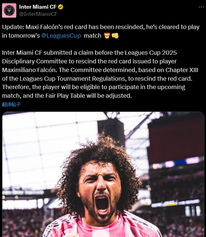 邁阿密官方寫(xiě)道:“最新消息:法爾肯的紅牌已被撤銷(xiāo),他將可以出戰明天的 聯(lián)盟杯比賽?!?/p>