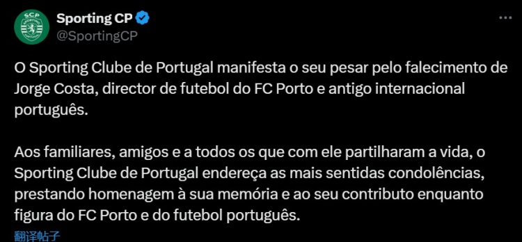 “葡萄牙體育俱樂(lè )部向他的家人、朋友以及所有與他共度人生的人致以最深切的慰問(wèn),向他作為波爾圖象征人物以及對葡萄牙足球所作出的貢獻致以崇高的敬意?!?/p>