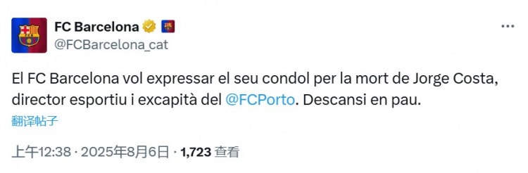 8月6日訊 前葡萄牙國腳、波爾圖體育總監若熱-科斯塔離世,巴薩官方發(fā)文哀悼。