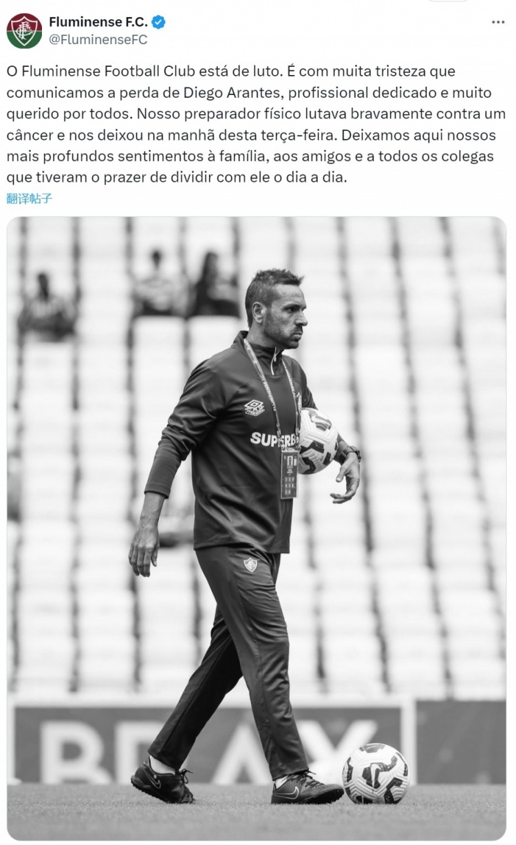 弗魯米嫩塞體能教練阿蘭特斯在本周二上午因癌癥離世,俱樂(lè )部官方社媒發(fā)文致哀:“弗魯米嫩塞足球俱樂(lè )部沉浸在悲痛之中,我們懷著(zhù)無(wú)比沉重的心情宣布,迭戈-阿蘭特斯去世?!?/p>