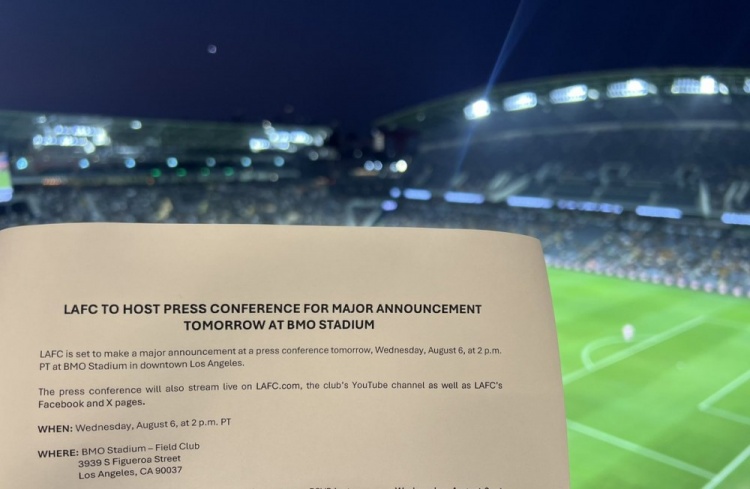 Justin Ruderman社媒曬出公告函,確認洛杉磯FC將在當地時(shí)間8月6日14點(diǎn)召開(kāi)新聞發(fā)布會(huì ),屆時(shí)將宣布“重大消息”。