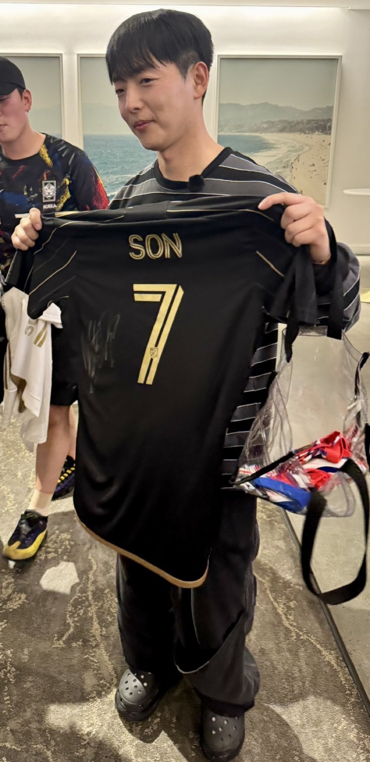 一位球迷手拿孫興慜印號的洛杉磯FC球衣接機,并獲得了孫興慜的簽名,記者Favian Renkel社媒曬出照片,配文:“這絕對是第一件帶有簽名的洛杉磯FC孫興慜球衣,獨一無(wú)二的珍品!”