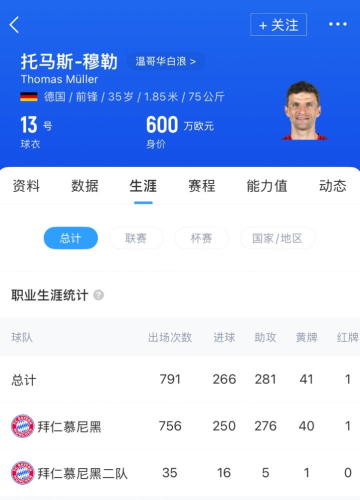 穆勒在今夏結束了與拜仁的合同,自由身離隊。在拜仁一線(xiàn)隊生涯他出場(chǎng)756場(chǎng)貢獻250球276助攻。隨隊贏(yíng)得了2座歐冠、2座歐超杯、13座德甲、6座德國杯、8次德超杯和2座世俱杯。此外,他還隨德國贏(yíng)得了2014世界杯。