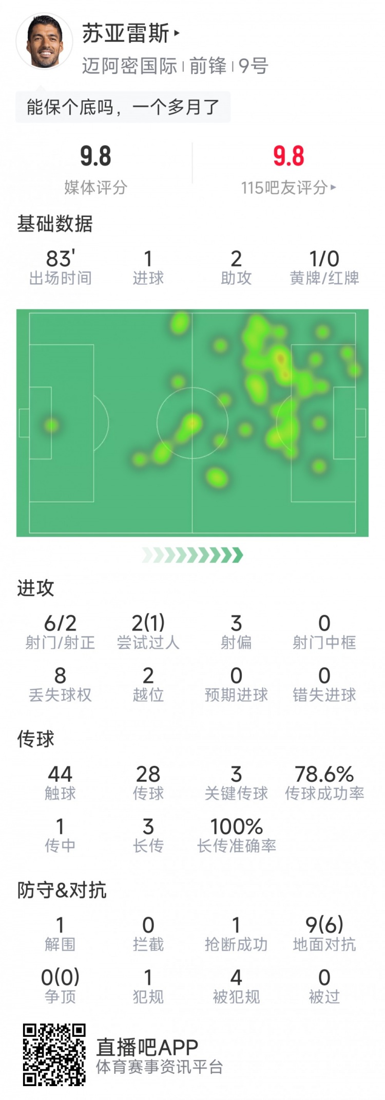 8月7日訊 在聯(lián)盟杯小組賽邁阿密?chē)H對陣墨西哥美洲獅的比賽中,蘇亞雷斯首發(fā)出戰表現出色,以下為他在本場(chǎng)數據: