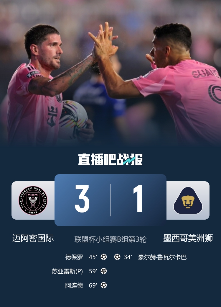 8月7日訊 北京時(shí)間8月7日上午7:30,聯(lián)盟杯小組賽B組第3輪,邁阿密?chē)H坐鎮大通體育場(chǎng)迎戰墨西哥美洲獅。上半場(chǎng),豪爾赫凌空斬,蘇亞雷斯助攻德保羅扳平。下半場(chǎng),蘇亞雷斯勺子點(diǎn)球破門(mén),隨后他再助攻阿連德進(jìn)球。全場(chǎng)結束,邁阿密?chē)H3-1墨西哥美洲獅。本場(chǎng)過(guò)后,邁阿密?chē)H3戰3勝(其中1場(chǎng)點(diǎn)球獲勝)鎖定出線(xiàn)。