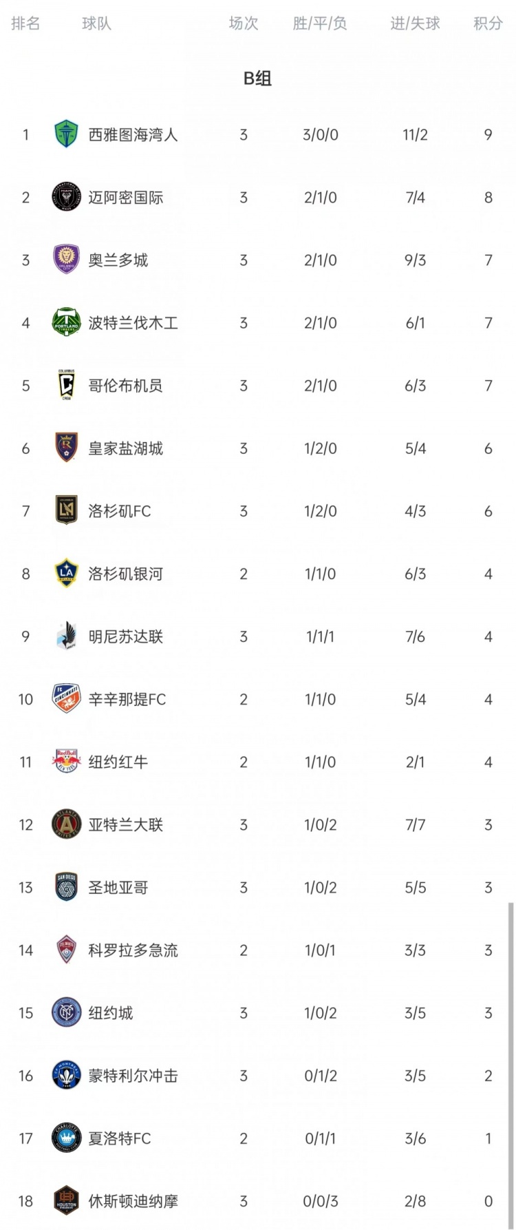 8月7日訊 聯(lián)盟杯小組賽第三輪多場(chǎng)比賽戰罷,邁阿密?chē)H積8分鎖定B組第二位,西雅圖海灣人積9分居首。
