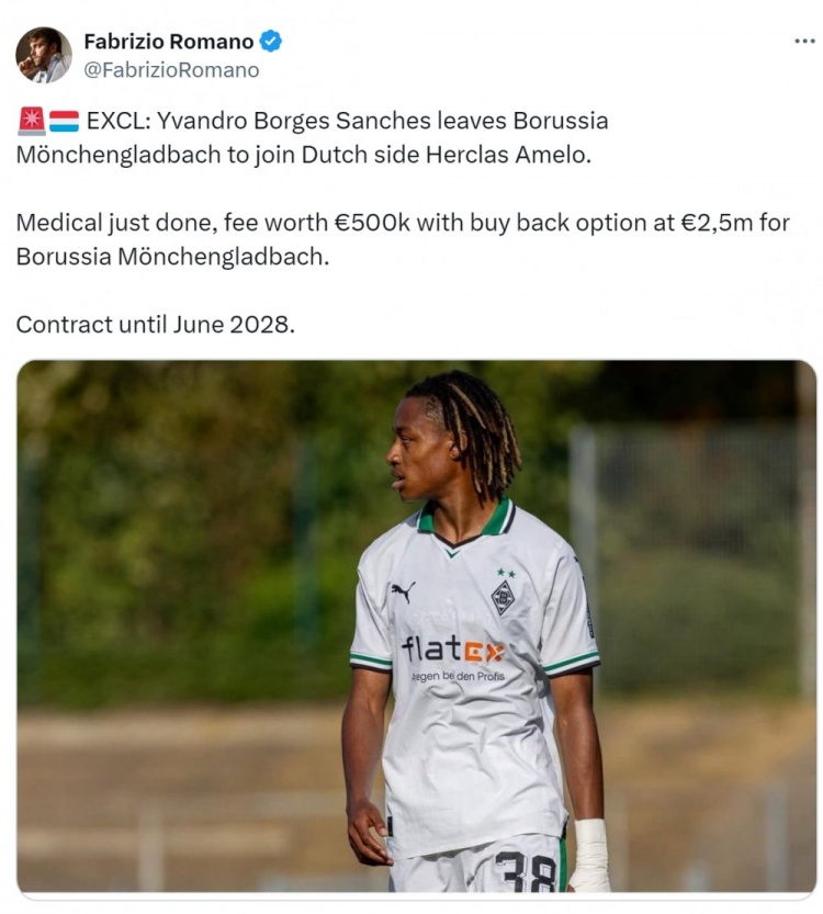 羅馬諾透露,門(mén)興小將桑切斯將加盟赫拉克勒斯,球員已經(jīng)完成體檢,轉會(huì )費50萬(wàn)歐元,協(xié)議中包含250萬(wàn)歐元的回購條款,桑切斯將與赫拉克勒斯簽約至2028年6月份。