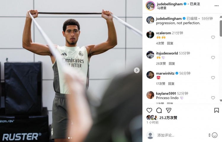 貝林厄姆在個(gè)人社媒曬出自己進(jìn)行康復訓練的照片,配文寫(xiě)道:“有一些進(jìn)展,但還不夠完美?!?/p>