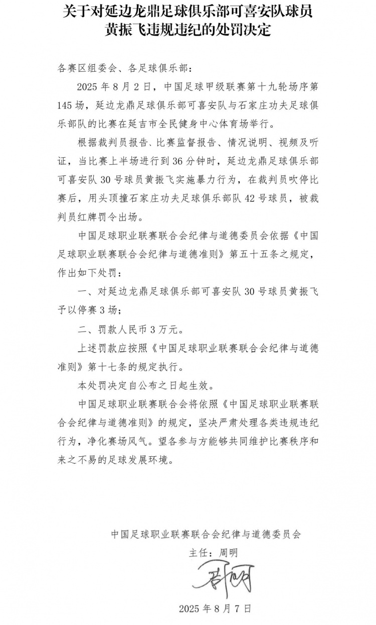 8月2日中甲第19輪延邊龍鼎主場(chǎng)對陣石家莊功夫,比賽第36分鐘,延邊龍鼎球員黃振飛在裁判吹停比賽后,用頭頂撞對方球員,被紅牌罰下。中足聯(lián)對延邊龍鼎球員黃振飛予以停賽3場(chǎng),罰款人民幣3萬(wàn)。