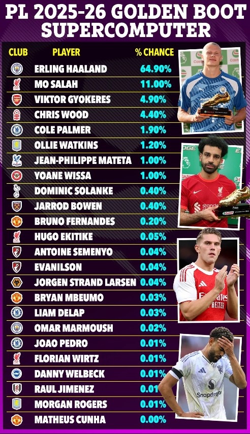 8月8日訊 根據《太陽(yáng)報》報道,超算預測新賽季英超射手榜,哈蘭德有64.9%的概率拿到金靴,薩拉赫11%第二。