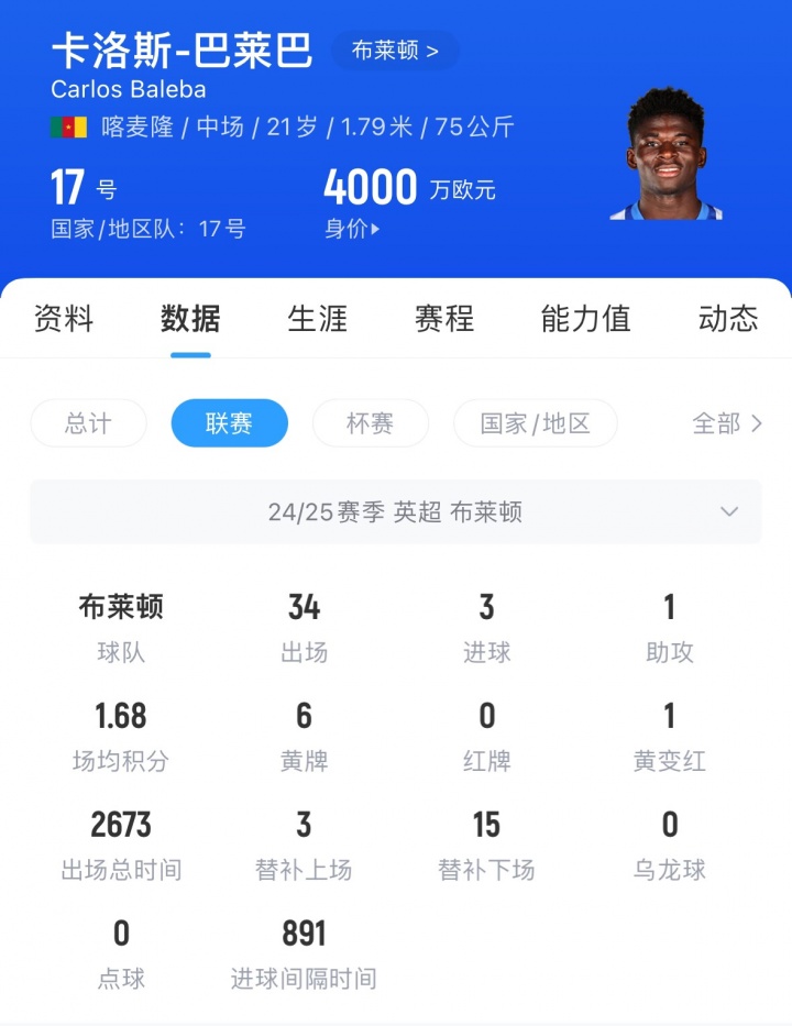 巴萊巴現年21歲,身高1米79,左腳球員司職后腰,他與球隊現有合同在2028年到期,另有一年續約選項。巴萊巴德轉現估值4000萬(wàn)歐。