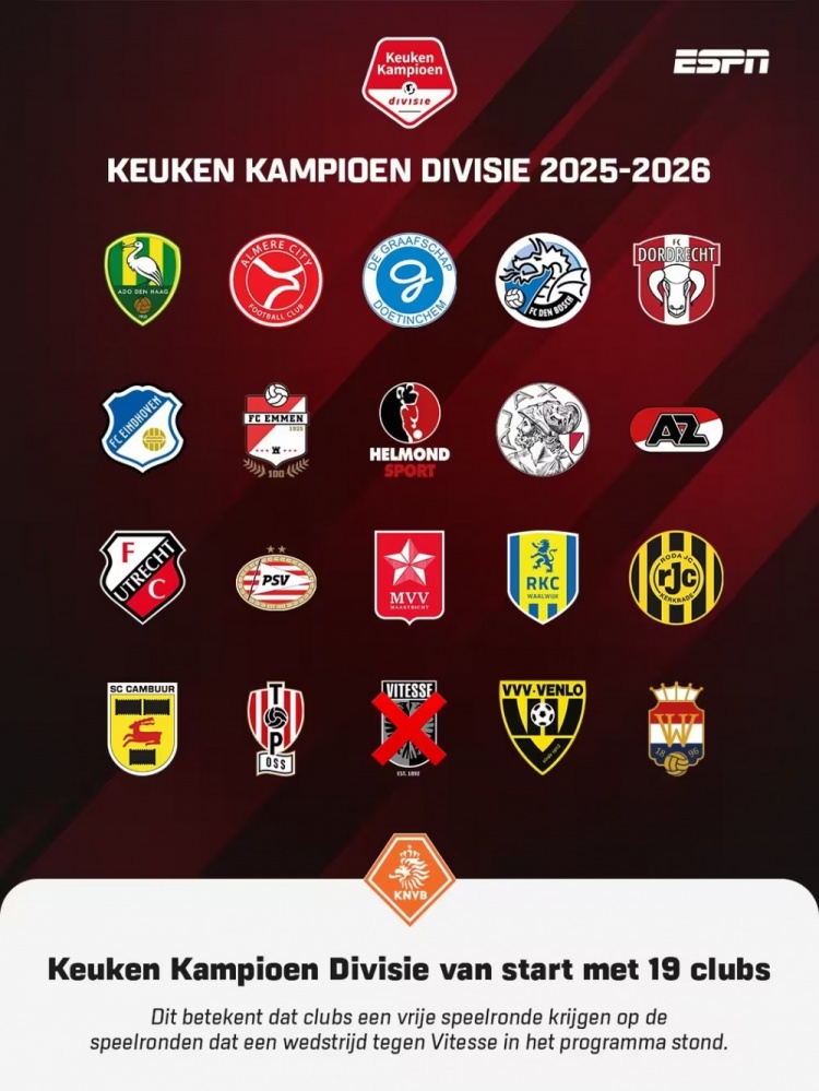 由于負債嚴重,維特斯的職業(yè)執照在此前被吊銷(xiāo),禁止參加職業(yè)聯(lián)賽,新賽季荷乙參賽球隊數量從20支減至19支,中國前鋒張玉寧曾在此效力。