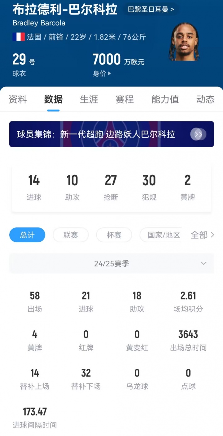 巴爾科拉上賽季隨巴黎獲得了多項冠軍錦標,他目前的德轉身價(jià)為7000萬(wàn)歐元。