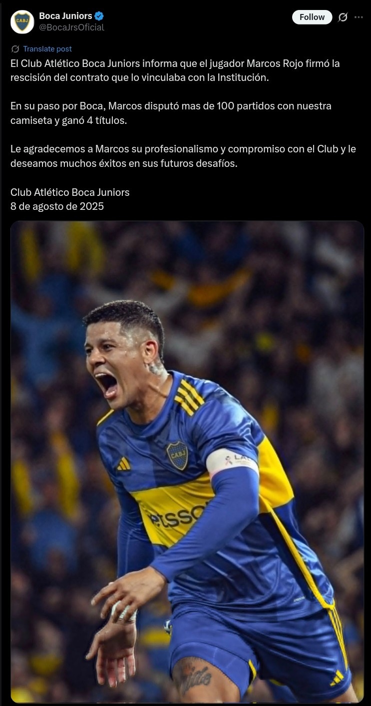博卡官推寫(xiě)道:“博卡青年俱樂(lè )部宣布,馬科斯-羅霍已與俱樂(lè )部解約。在效力博卡期間,馬科斯共為球隊出戰超過(guò)100場(chǎng)比賽,并贏(yíng)得了4座冠軍獎杯。我們感謝羅霍的職業(yè)精神和對俱樂(lè )部的承諾,并祝愿他在未來(lái)的挑戰中取得更多成功?!?/p>