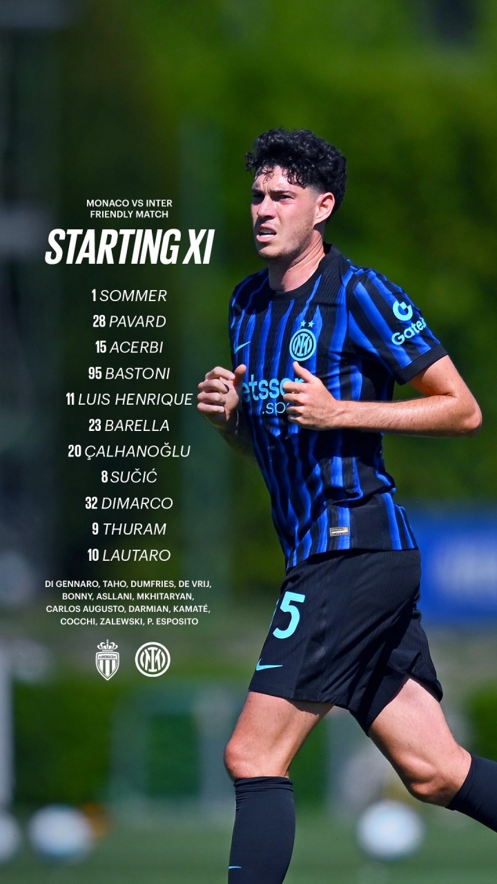 國米首發(fā):1-索默、15-阿切爾比、28-帕瓦爾、32-迪馬爾科、95-巴斯托尼、23-巴雷拉、8-蘇西奇、20-恰爾汗奧盧、9-圖拉姆、10-勞塔羅、11-恩里克