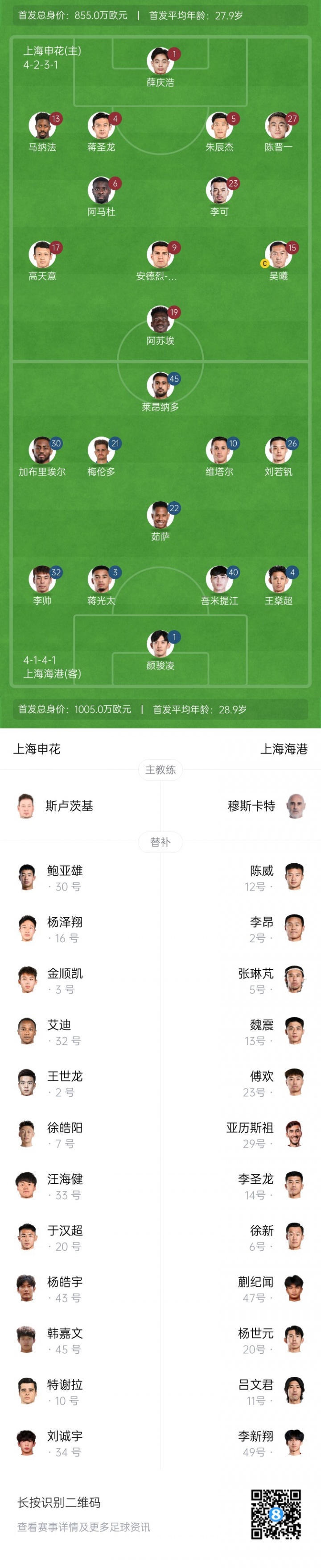 08月09日訊 北京時(shí)間19:35,中超第20輪,上海申花主場(chǎng)迎戰上海海港,賽前雙方公布首發(fā)。