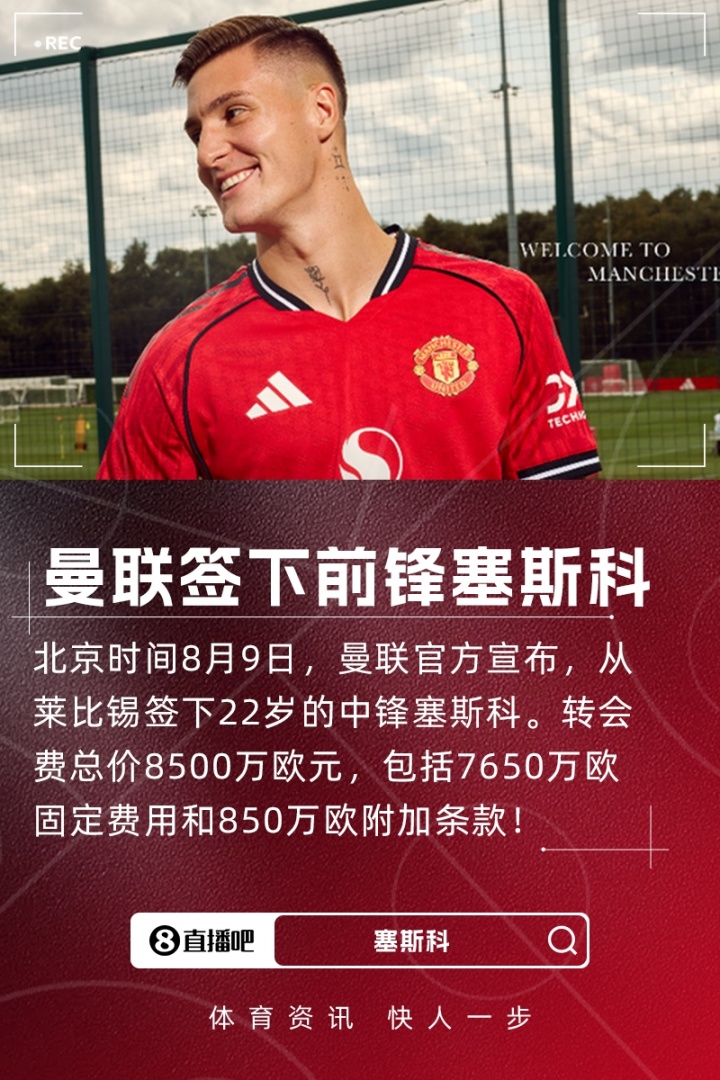 08月09日訊 曼聯(lián)官方宣布,從萊比錫簽下22歲的中鋒塞斯科。據多家媒體此前報道,塞斯科的轉會(huì )費總價(jià)8500萬(wàn)歐元,包括7650萬(wàn)歐固定費用和容易實(shí)現的850萬(wàn)歐附加條款。