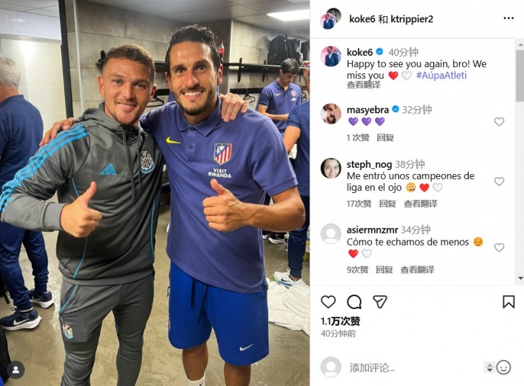 8月10日訊 季前友誼賽,馬競以2-0的比分戰勝紐卡。本場(chǎng)比賽,馬競舊將特里皮爾為紐卡首發(fā)出戰。賽后,馬競隊長(cháng)科克曬出了兩人的合影。