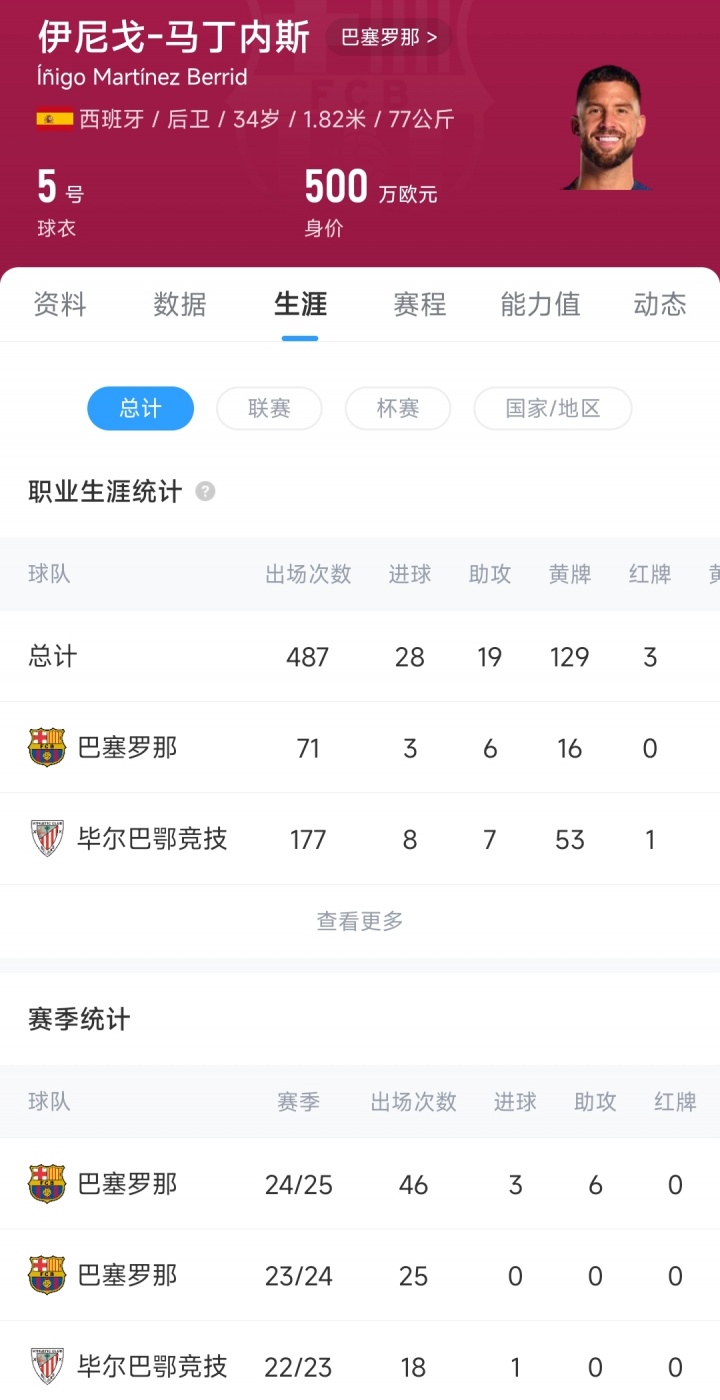 34歲的西班牙后衛伊尼戈-馬丁內斯,2023年7月自由身加盟巴薩,兩個(gè)賽季共代表巴薩出戰71場(chǎng)比賽,打進(jìn)3球并送出6次助攻。目前伊尼戈-馬丁內斯的德轉身價(jià)為500萬(wàn)歐元。