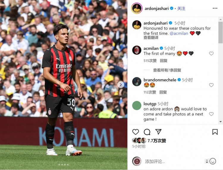 亞沙里更新社媒動(dòng)態(tài),曬出比賽照片,配文:“很榮幸首次身披米蘭球衣參加比賽?!?/p>