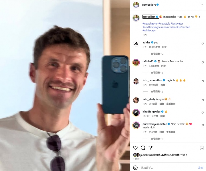 穆勒在社媒上發(fā)布了一張略顯模糊的自拍照,臉上新留了胡子,笑容滿(mǎn)面。他還直接問(wèn)粉絲們要不要留胡子。