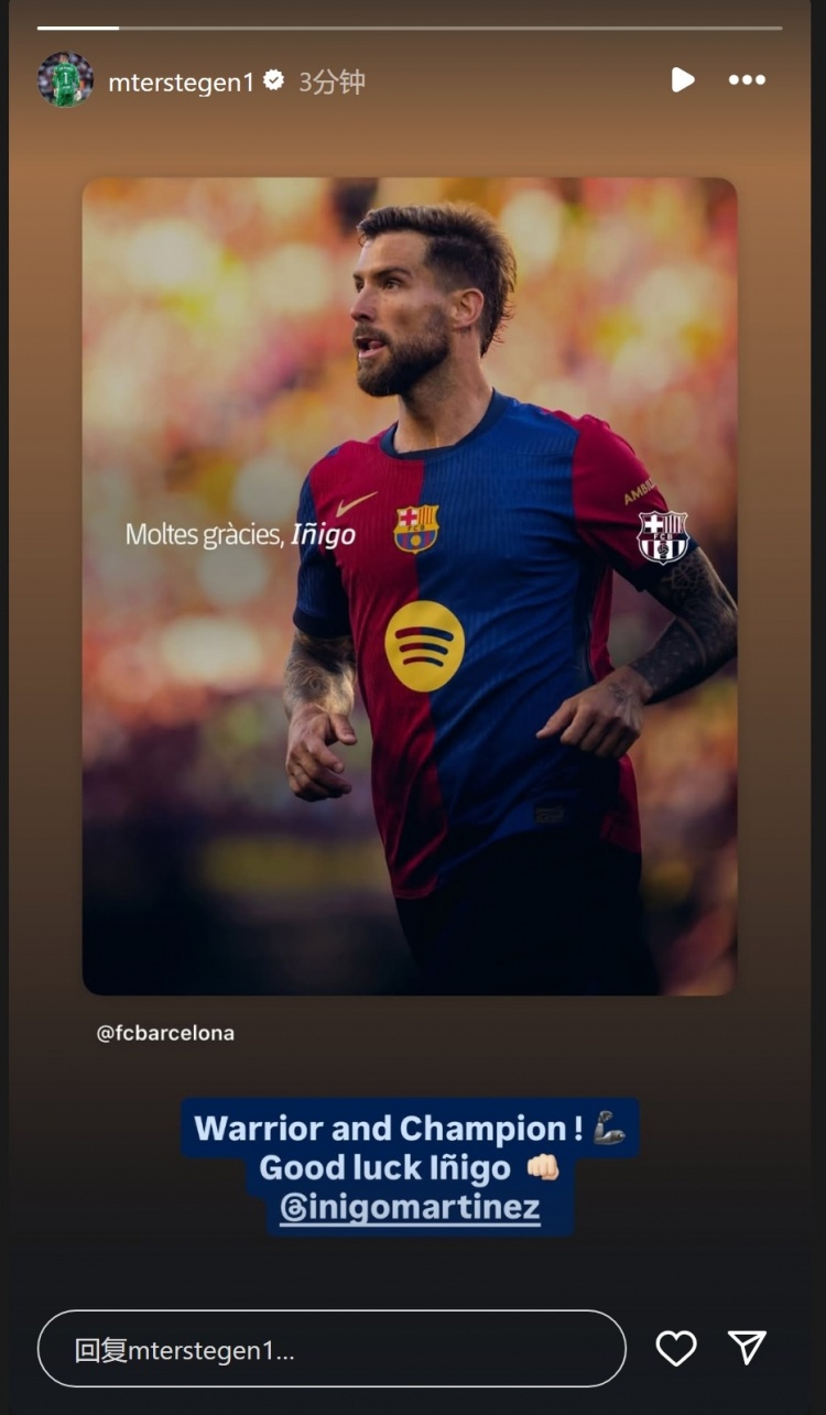 特爾施特根社媒轉發(fā)伊尼戈的海報,配文:“勇士與冠軍,祝你好運,伊尼戈!”