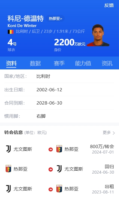 德溫特現年23歲,比利時(shí)籍,身高1米93,上賽季為熱那亞出場(chǎng)26場(chǎng),身價(jià)2200萬(wàn)歐元。