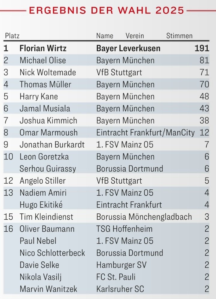 8月11日訊 維爾茨當選2025年德國足球先生,《踢球者》曬出了得票詳情,維爾茨獲得191票最多,奧利塞、沃爾特馬德二三位。