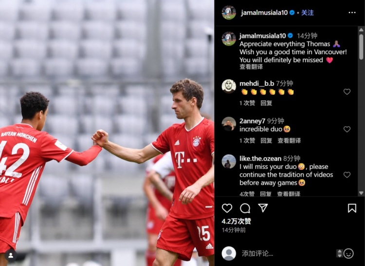 穆西亞拉社媒寫(xiě)道:感謝你所做的一切托馬斯????祝你在溫哥華一切順利,一定會(huì )想念你的??