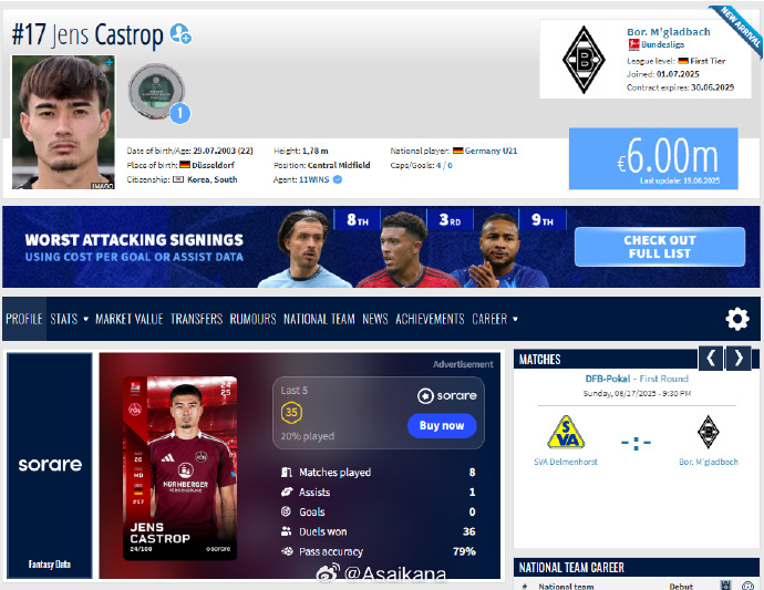 卡斯特羅普今年22歲,司職中場(chǎng),曾入選過(guò)德國多個(gè)年齡段的青少年代表隊。他的父親是德國人,母親是來(lái)自韓國的移民,球員從小在德國出生,并在杜塞爾多夫、科隆參加青訓。今夏剛剛從紐倫堡加盟門(mén)興,目前德轉身價(jià)600萬(wàn)歐元。