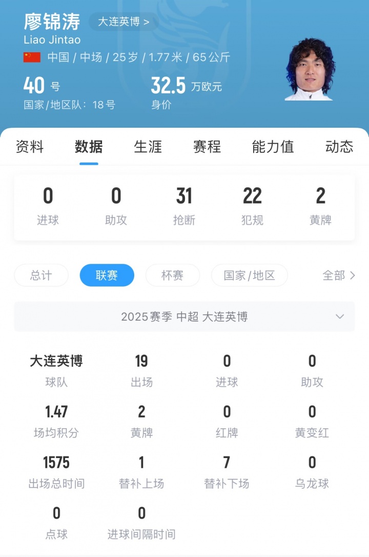 廖錦濤今年年初自由身加盟大連英博,本賽季為球隊出場(chǎng)19次。6月底,廖錦濤首度入選了中國男足國家隊。