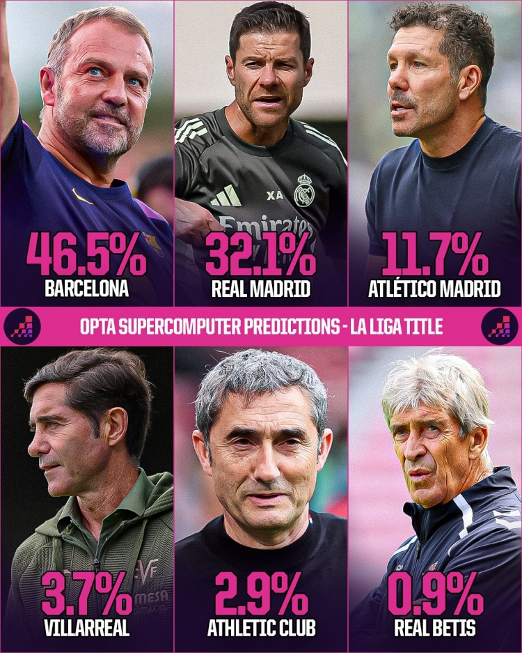■以下是Opta超級計算機預測新賽季西甲冠軍歸屬概率: