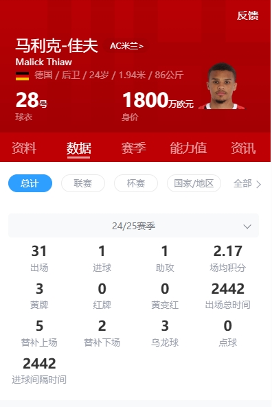 佳夫現年24歲,身高1米94,上賽季各項賽事為AC米蘭出場(chǎng)31場(chǎng),現身價(jià)1800萬(wàn)歐元。