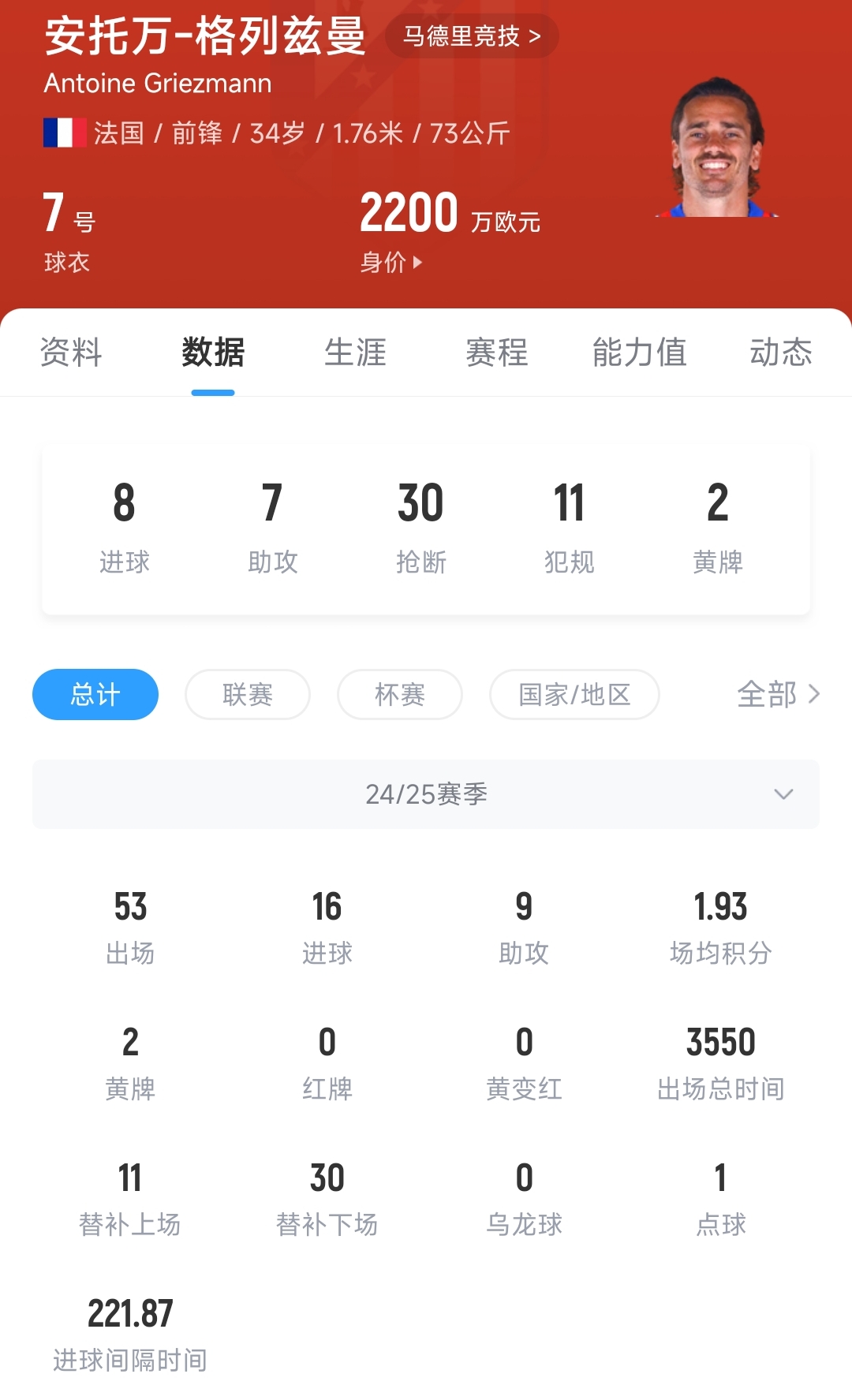 34歲的格列茲曼共為馬競出戰442場(chǎng)比賽,貢獻197球93助,目前球員德轉身價(jià)2200萬(wàn)歐。