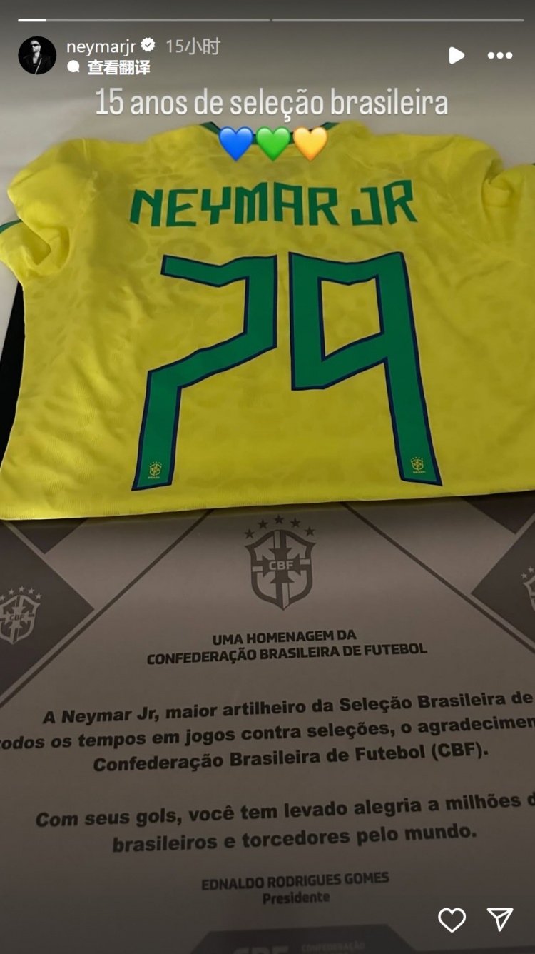 內馬爾社媒曬出國家隊79球紀念球衣,以及足協(xié)向他致敬的獎?wù)?,配文:“巴西國家隊首?5周年?!?/p>