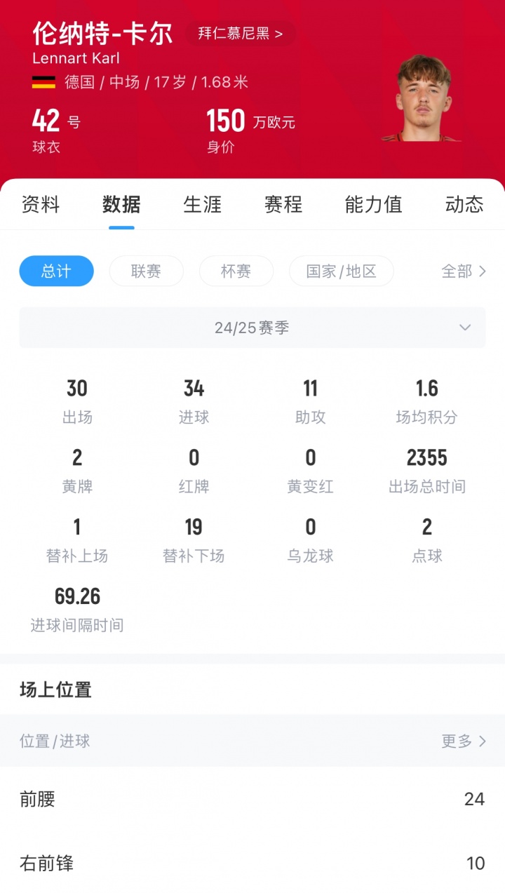 上賽季,他為拜仁青年隊共計出場(chǎng)30次,貢獻34球11助攻。
