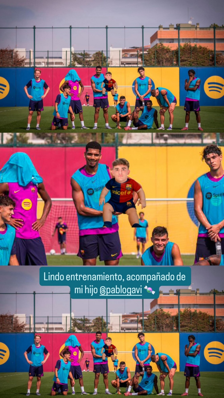 照片中,阿勞霍和隊友合影,手中P上了嬰兒加維,并寫(xiě)道:“美好的訓練時(shí)光,有兒子相伴左右?!?/p>
