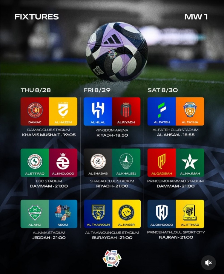 8月13日訊 新賽季沙特聯(lián)將于本月底拉開(kāi)帷幕。沙特聯(lián)官方公布了2025/26賽季首輪9場(chǎng)比賽的比賽時(shí)間,具體如下(時(shí)間換算為北京時(shí)間,主隊在前):
