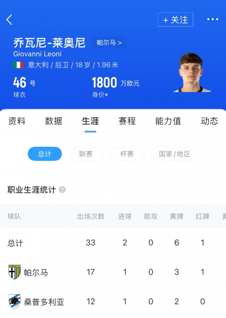萊奧尼現年18歲,身高1米96司職中衛,球員目前德轉估值1800萬(wàn)歐。