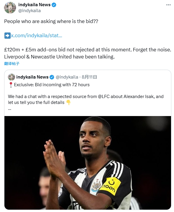 被球迷戲稱(chēng)為“綠帽哥”的indykaila News再爆猛料:利物浦已經(jīng)1.2億鎊+500萬(wàn)浮動(dòng)報價(jià)伊薩克,目前紐卡尚未拒絕這份新的報價(jià)。