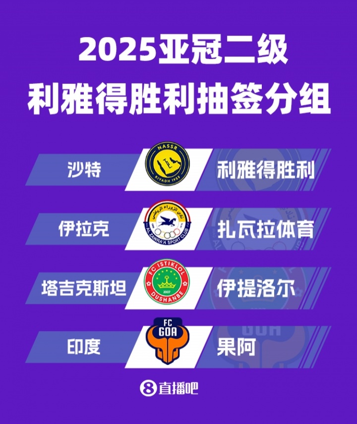 08月15日訊 25/26賽季亞冠二級聯(lián)賽小組賽抽簽,利雅得勝利為西亞區的一檔球隊,同組對手如下。