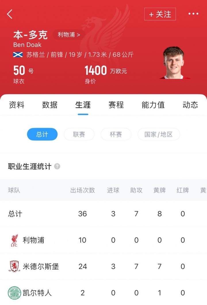本-多克現年19歲,上賽季被利物浦外租至英冠球隊米德?tīng)査贡?,出?chǎng)24次貢獻3球7助,目前他的德轉身價(jià)為1400萬(wàn)歐元。