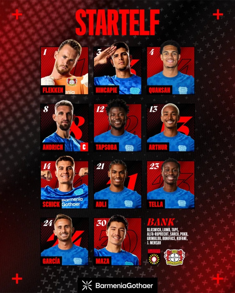 勒沃庫森首發(fā):1-弗萊肯、3-因卡皮耶、4-寬薩、8-安德里希、12-塔普索巴、13-阿圖爾-奧古斯托、14-???、21-阿明-阿德利、23-內森-泰拉、24-阿萊克斯-加西亞、30-馬扎