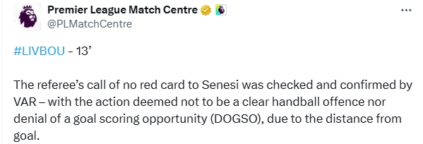 08月16日訊 利物浦vs伯恩茅斯第14分鐘,利物浦反擊,塞內西手球動(dòng)作未判引爭議。英超官方給出了解釋。