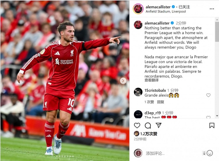 麥卡利斯特賽后在社交媒體上寫(xiě)道:“沒(méi)有什么比以主場(chǎng)勝利開(kāi)啟英超賽季更棒的了。安菲爾德的氛圍無(wú)以言表。我們將永遠懷念你,迪奧戈(若塔)?!?/p>